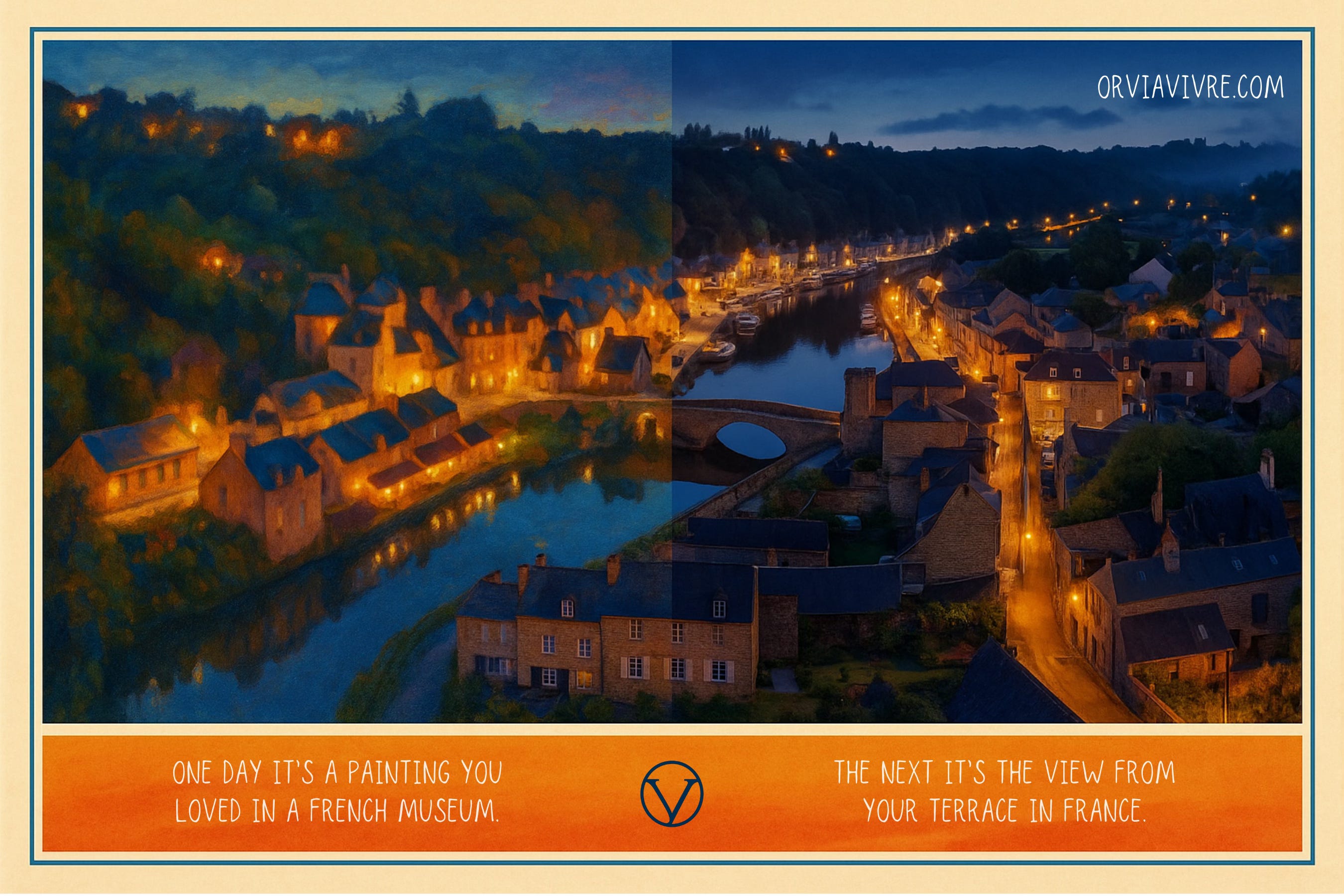 PS – The image above is Dinan, Brittany at blue hour—half rendered like an oil‑on‑canvas and half photographed from one of our favorite terraces. It’s a reminder that Any postcard can become your postcode.™️